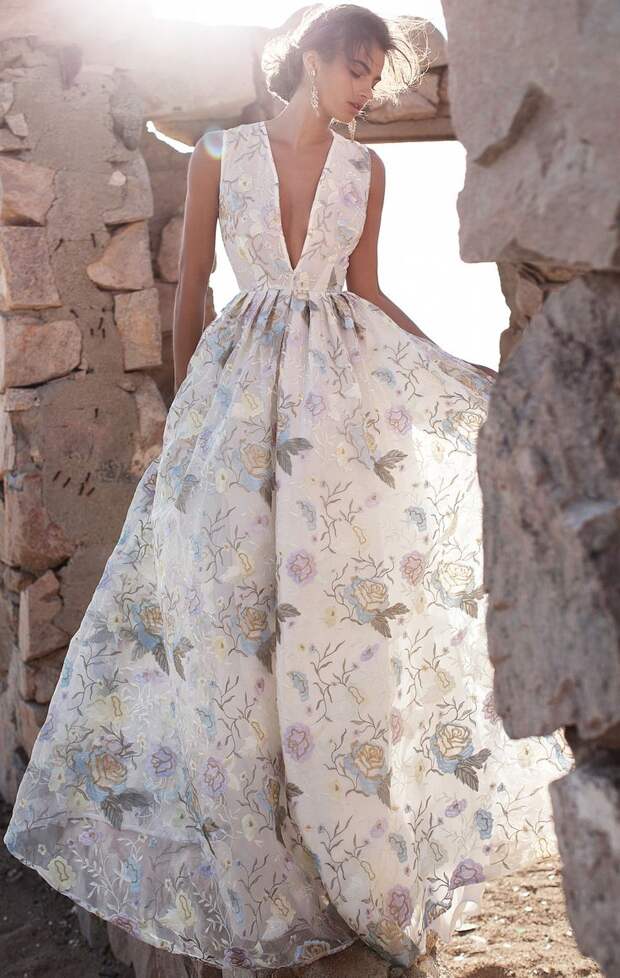 В наши дни не трудно найти свадебное платье с цветочными узорами. Этот принт прекрасно подходит для подобного торжества. Свадебное платье могут украсить вышивки и аппликации в виде роз, бисерная россыпь. Подойдут пышные наряды и приталенные фасоны.