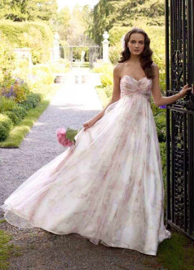 Свадебное платье с цветочным принтом выглядит оригинально и романтично. К нему нужно подобрать аксессуары, напоминающие цветочные мотивы.